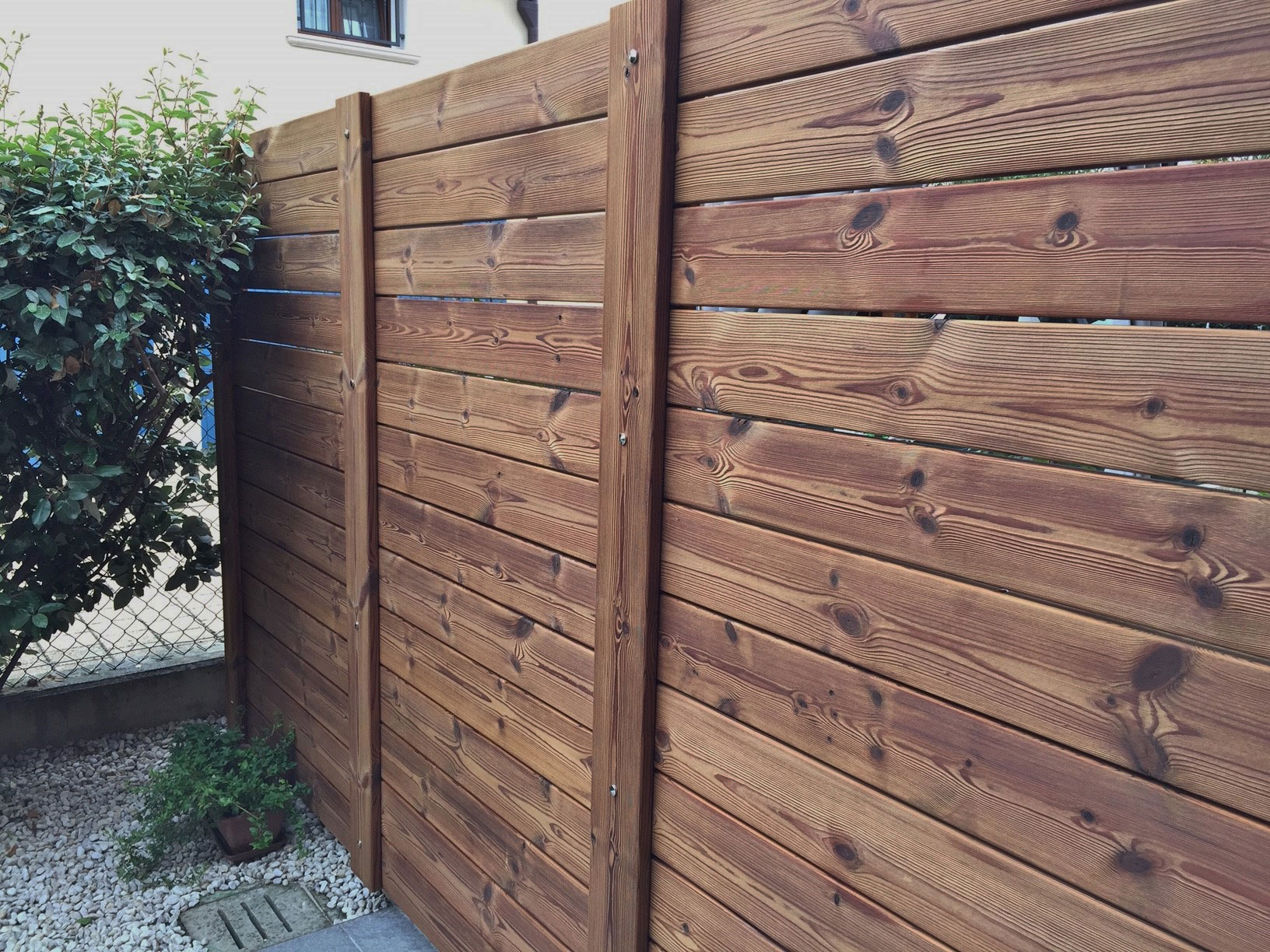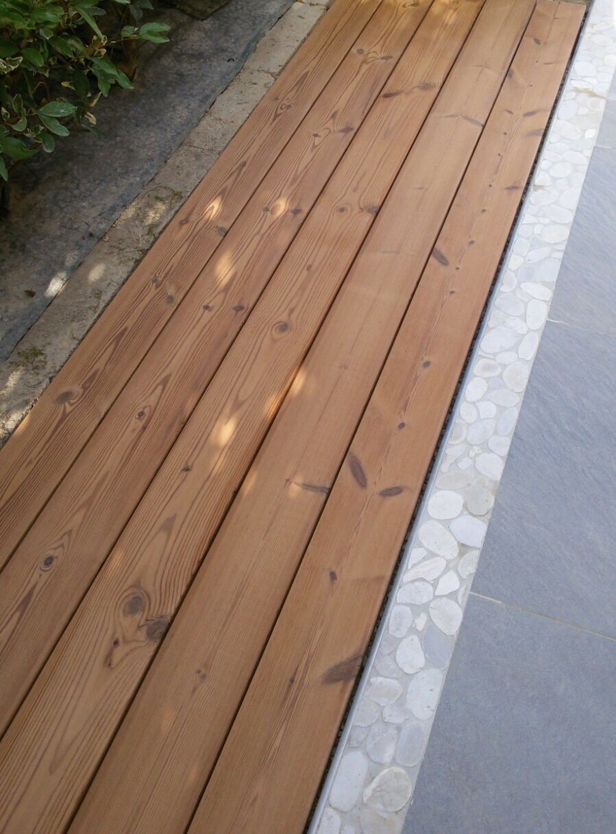 Materiale dal colore marrone tendente al bruno a seguito di procedimento di termo trattamento ad alte temperature che lo rende particolarmente resistente agli agenti atmosferici e stabile agli agenti umidi. Si presta quindi ad essere utilizzato per pavimentazioni esterne o rivestimenti di facciate sia in ambito pubblico che privato. La sua superficie spazzolata accentuata lo rende adatto come pavimentazione antiscivolo.