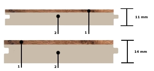Nel formato Standard lo strato a vista è in legno nobile, disponibile in varie essenze e finiture, da mm. 4,0 ed il supporto in compensato di betulla a strati incrociati da mm.7.